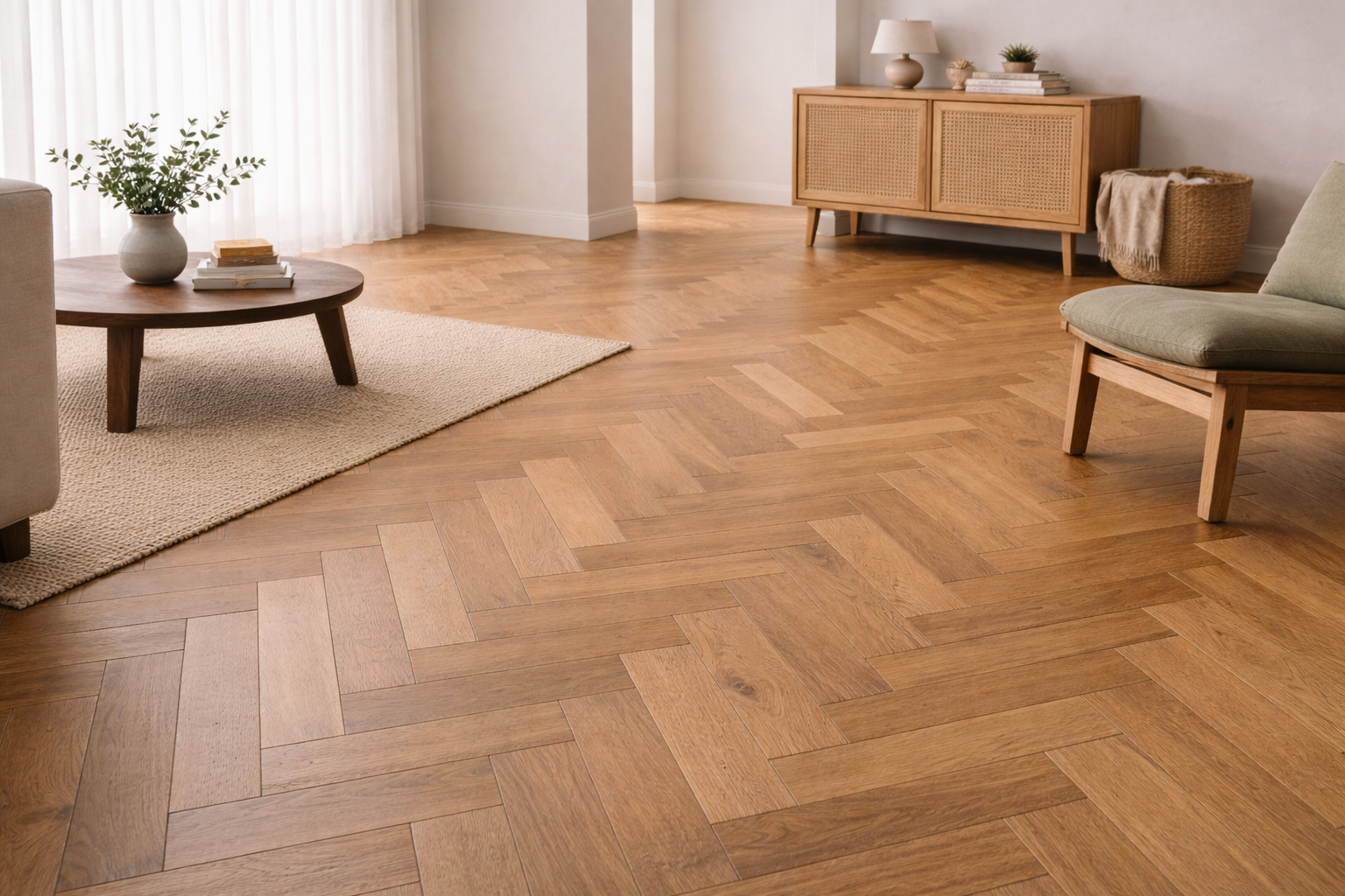 Et kuratert utvalg av gulv i parkett, fiskebein, herdet tre, laminat og vinyl. Vi kombinerer slitestyrke og estetikk for å skape et varig fundament som løfter helheten i rommet.